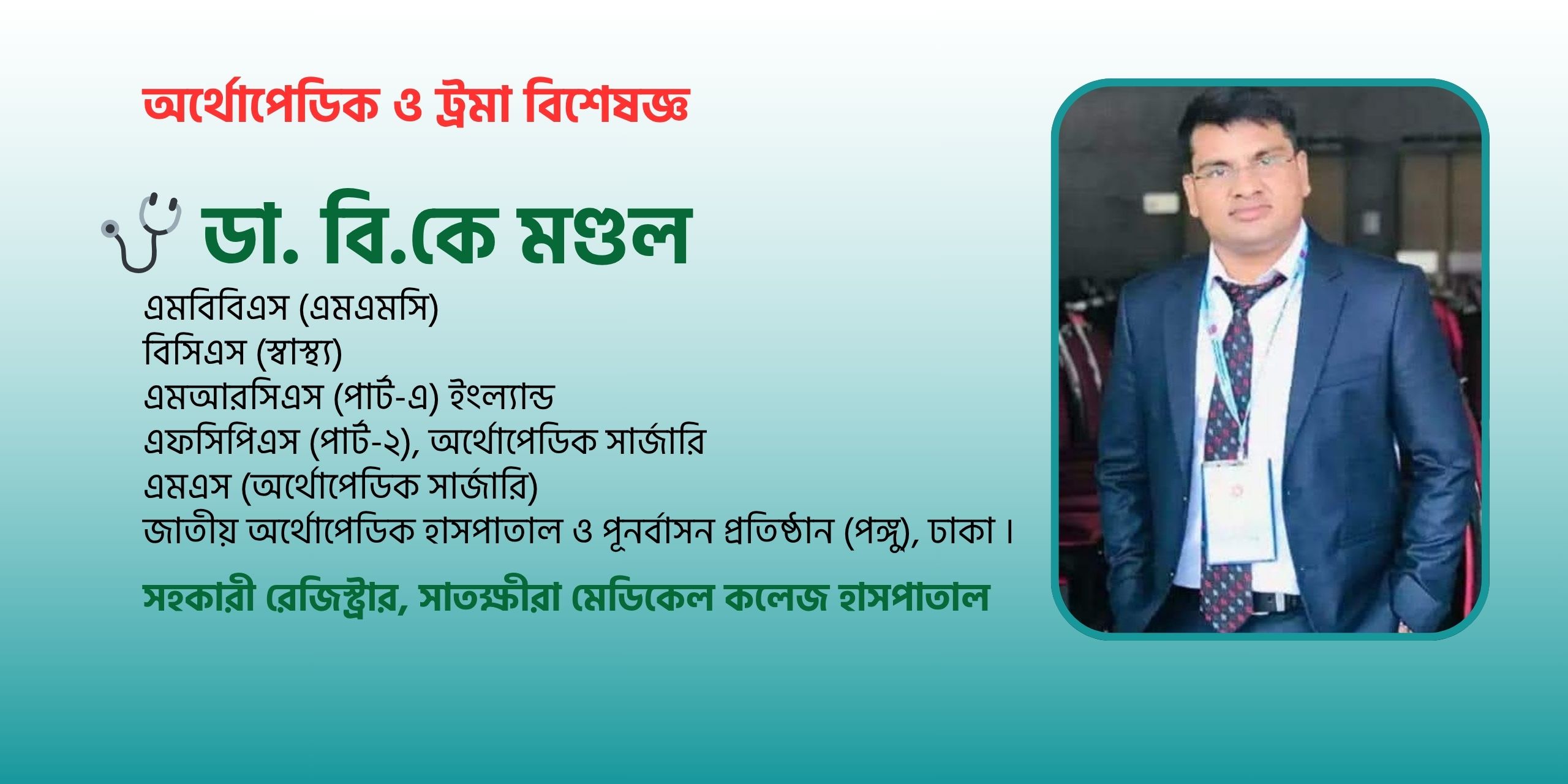 ডা. বি.কে মণ্ডল একজন দক্ষ ও অভিজ্ঞ অর্থোপেডিক ও ট্রমা বিশেষজ্ঞ, যিনি বহু বছর ধরে হাড়, জয়েন্ট ও মেরুদণ্ডের জটিল রোগের চিকিৎসায় সুনাম অর্জন করেছেন।